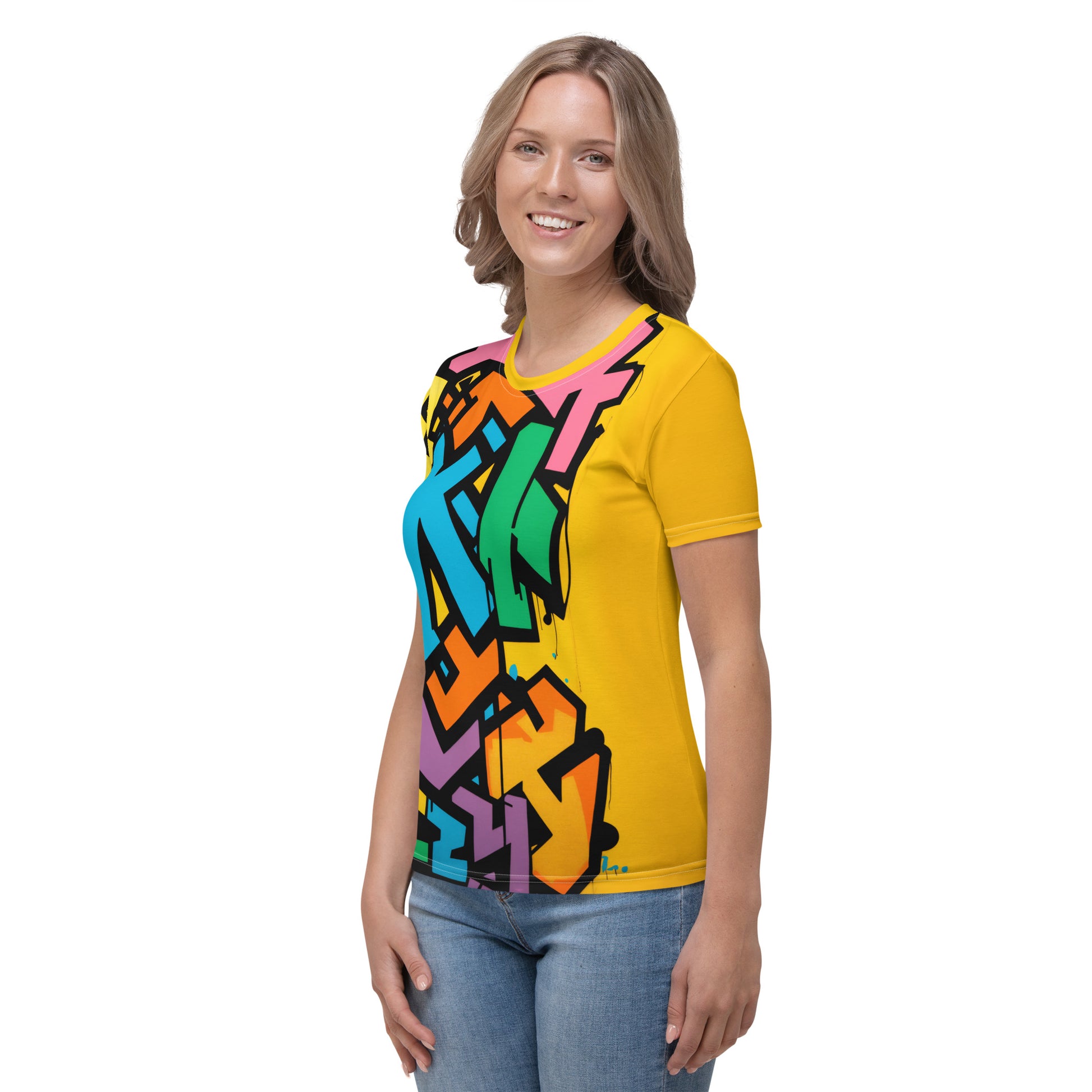 Bring street art to your wardrobe with our Women's "Graffiti Splash" Graphic T-Shirt. Featuring a vibrant and dynamic graffiti design, this tee captures the essence of urban culture and street art. The bold and colorful artwork makes this shirt a true standout piece, perfect for those who love unique and expressive fashion. Crafted from high-quality, breathable fabric, the "Graffiti Splash" t-shirt ensures exceptional comfort and durability, making it ideal for casual outings and urban adventures. Showcase your bold style and love for street art with this eye-catching graphic tee.